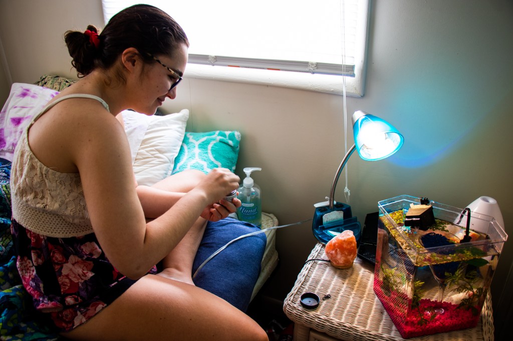 Sarah Moorehead feeds her fish Pepperona, who she got in February, in Blacksburg, Virginia, Tuesday, May 4, 2021.