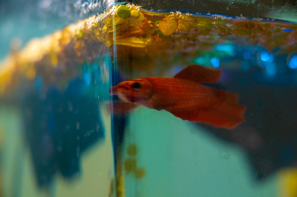 Pepperona, named after Sarah’s first fish named Pepperoni, taps the glass of her tank with her head, in Blacksburg, Virginia, Tuesday, May 4, 2021.
