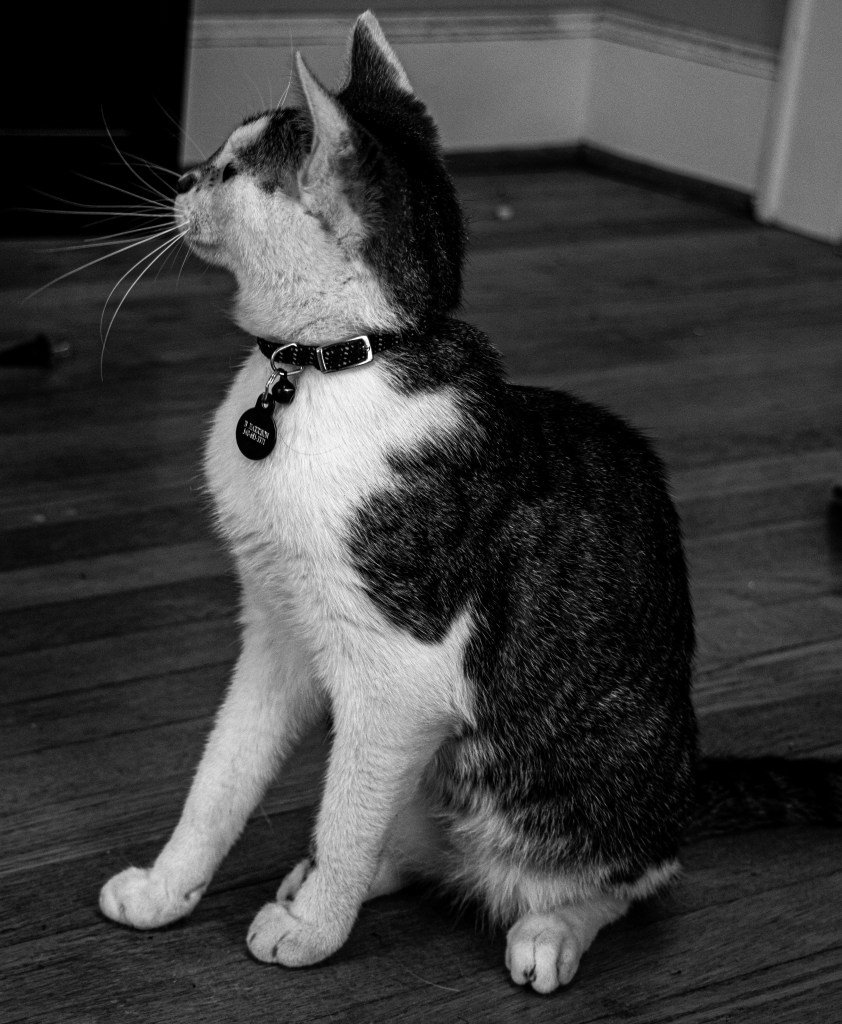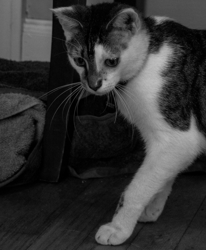 Bruce, the cat, prepares to pounce at a toy off across the room, in Blacksburg, Virginia, Thursday, May 6, 2021.