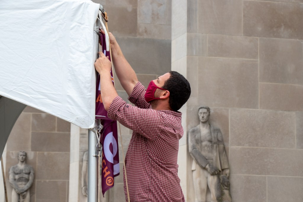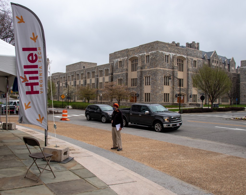 Members of the Virginia Tech Chapter of Hillel International finish setting up for The Reading of the Names to honor the victims of The Holocaust in Blacksburg, Virginia, Friday, April 9, 2021.
