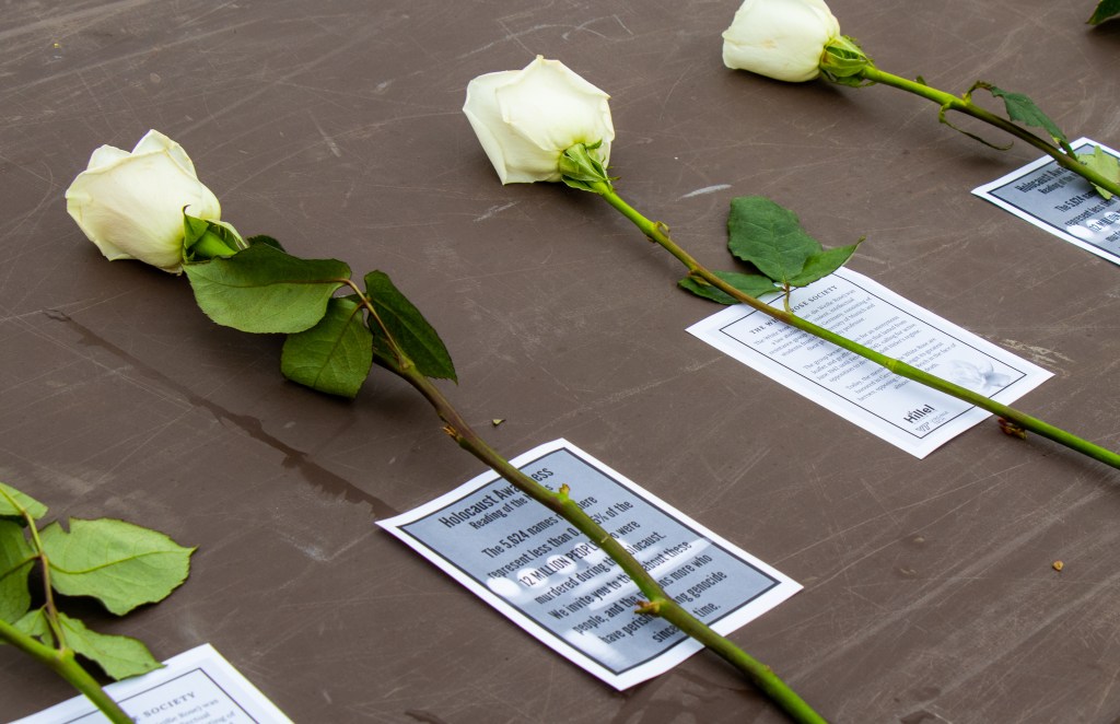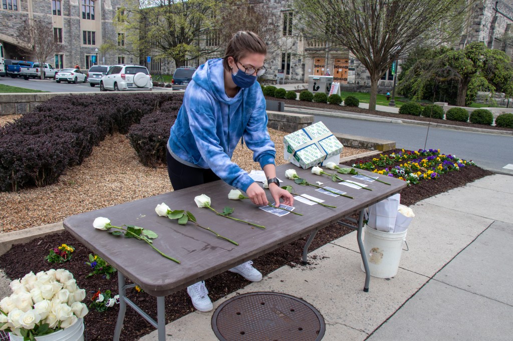 A volunteer sets a table of white roses for guests to take to honor The White Rose Society, a peaceful anti-Nazi group of students during The Holocaust in Blacksburg, Virginia, Friday, April 9, 2021.