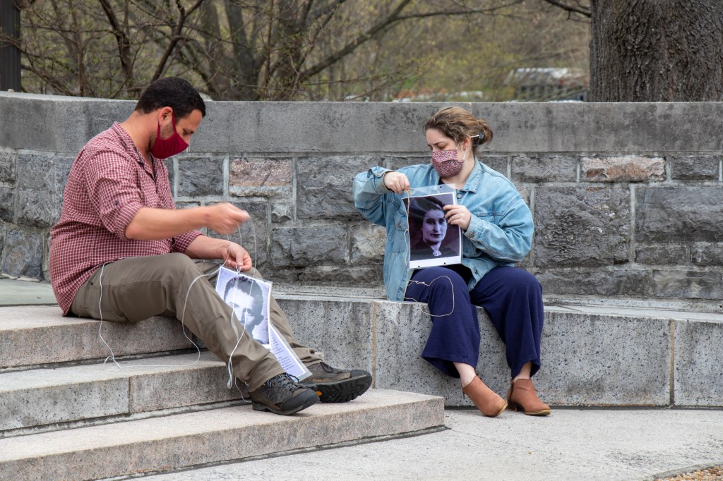 Volunteers string various photos of victims of The Holocaust to hang around the event in Blacksburg, Virginia, Friday, April 9, 2021.