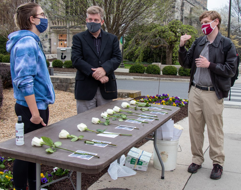 Grant Bigman, the event organizer, shown on the right, explains The Reading of the Names to a pedestrian, show on the left, who stopped to watch the event in Blacksburg, Virginia, Friday, April 9, 2021.